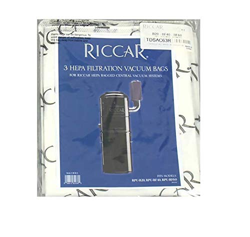 Riccar Central Vacuum HEPA Bags 3pk Riccar Central Vacuum Bags shipping weight dimensions Fits all Riccar central vacuum units, genuine product.   RCB 3 HEPA rating is the best rating in the USA for dust trapping capabilities. No Tax item.