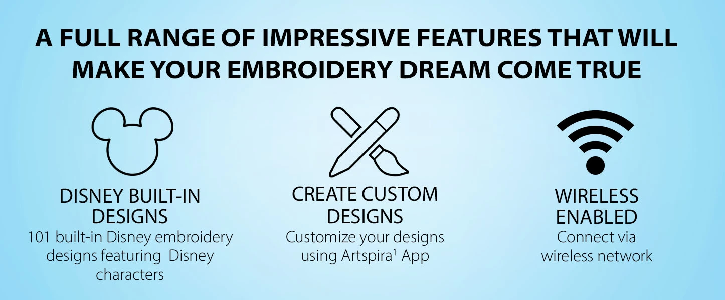 • Built-in Disney Designs- The Stellaire2 has 101 Disney embroidery designs built right in, featuring Disney's Mickey Mouse, Minnie Mouse, Goofy and Pluto. Plus, your favorite characters from Disney's Frozen, as well as Disney and Pixar's Finding Nemo and Cars! Brother customers get exclusive access to even more Disney and Disney•Pixar embroidery designs through the iBroidery.com Download Center‡.